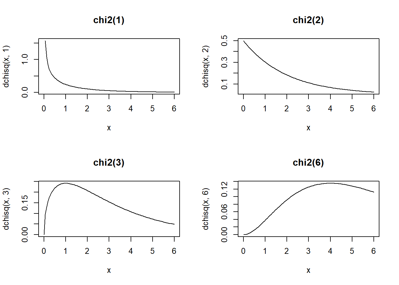 plot(x, dchisq(x, 6), main = "chi2(6)", type = "l")