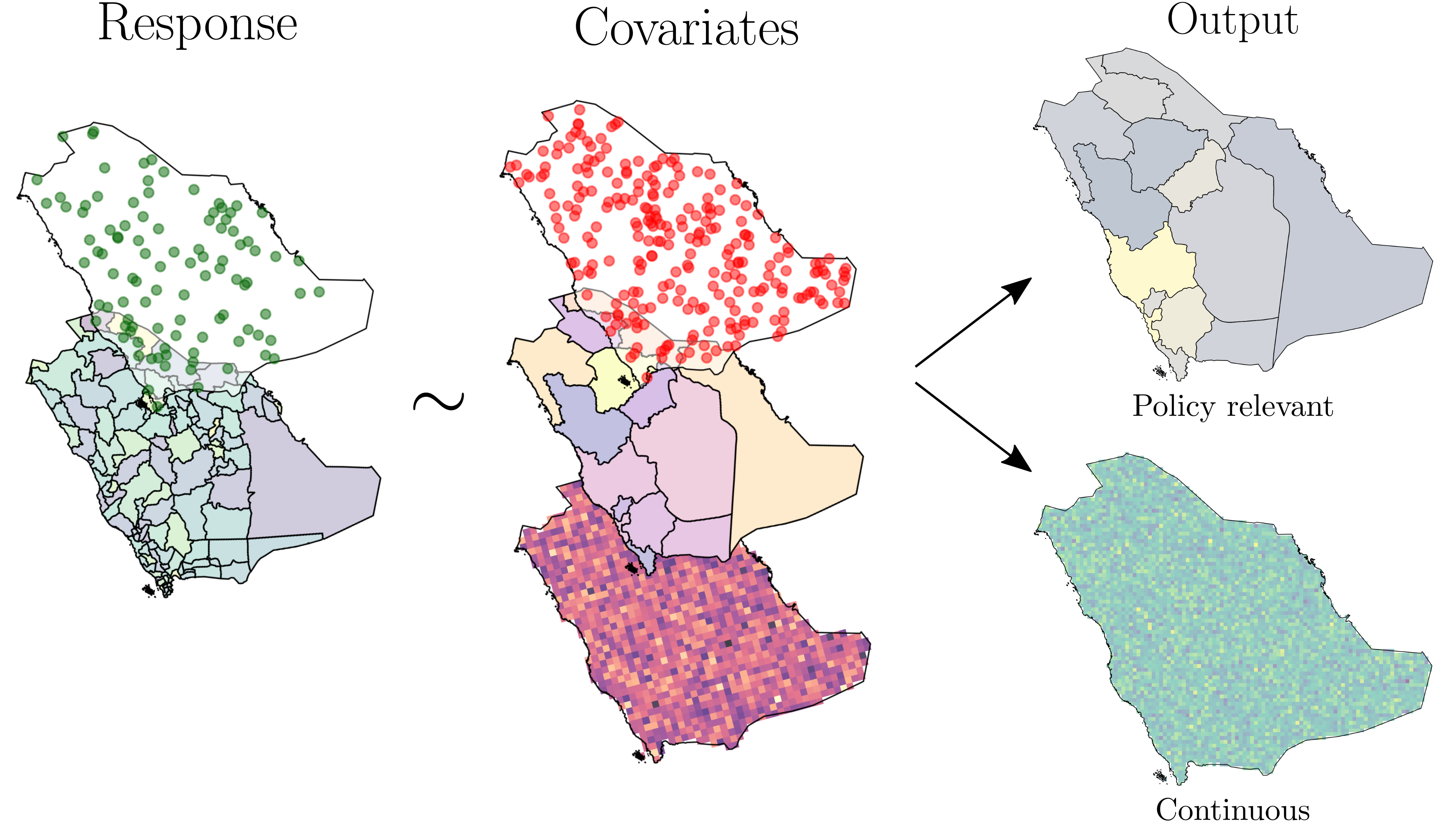 Areal data arise as region averages in regions \(B_j \subset D\) \[E[Y(B_j)]=|B_j|^{-1}\int_{B_j}(\mu(\boldsymbol{x})+S(\boldsymbol{x}))d\boldsymbol{x},\ |B_j|>0\] Moraga et al., Spatial Statistics, 2017